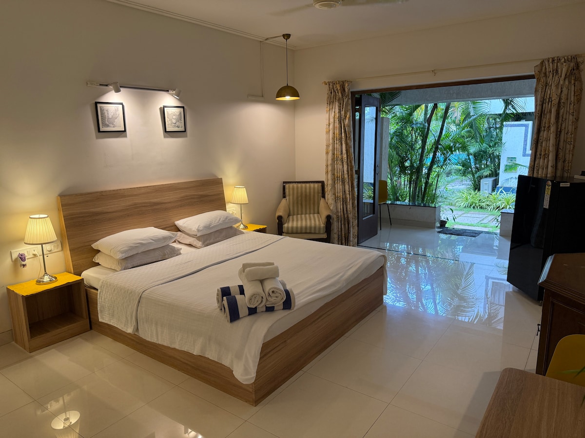 Cozy tropical themed studio in the heart of Vagator, just a short walk to the beach, Hilltop, Friday Night Market and top clubs like Romeo Lane & Mango tree restaurant. Styled with plants and earthy tones, it features a double bed, sofa & Smart TV, dining area, fully equipped kitchen and modern bathroom. Guests enjoy high-speed Wi-Fi, pool & gym access, parking for cars & bikes, 24/7 security & power backup. Perfect for couples, solo travelers or friends.