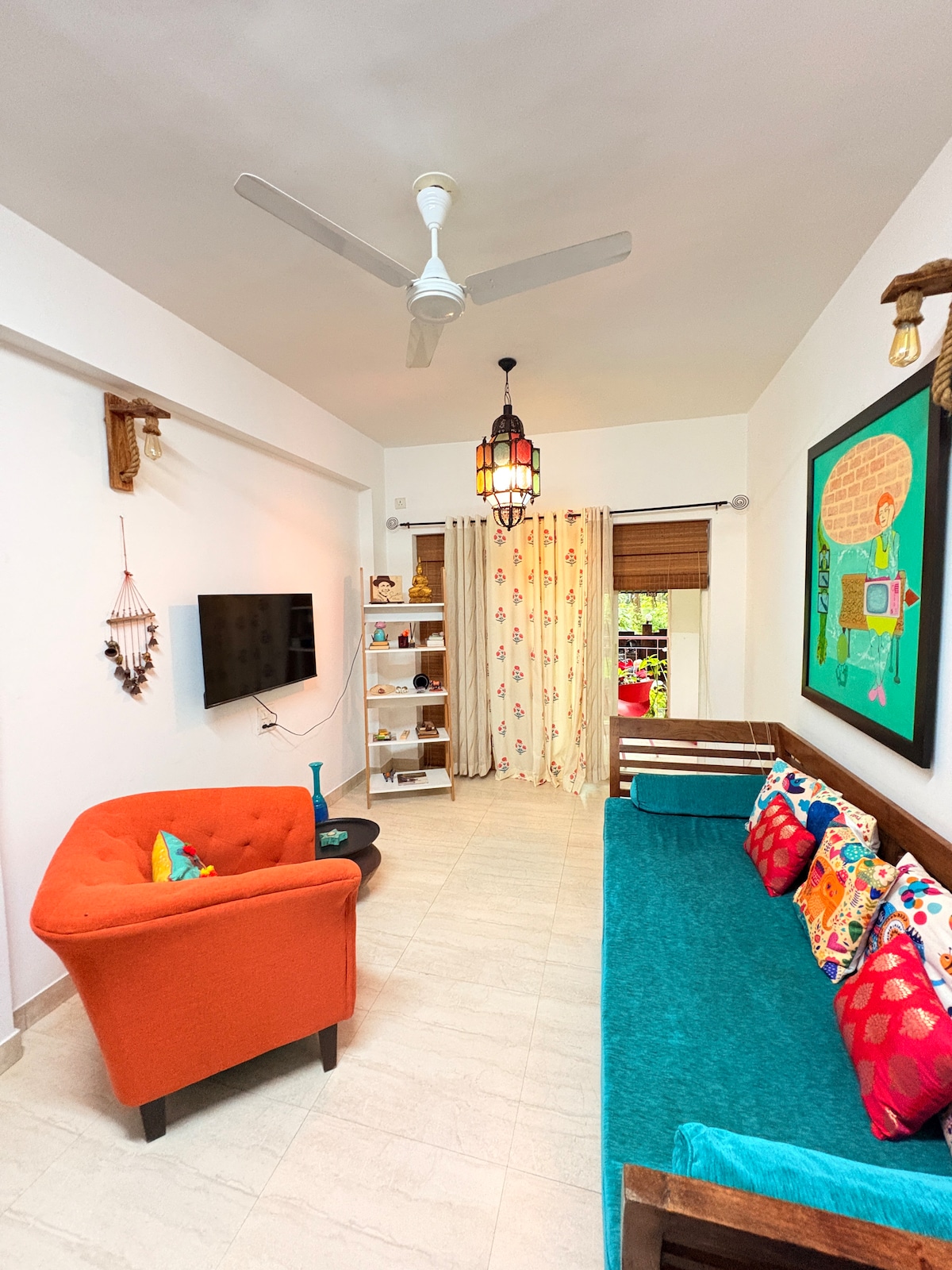 Certified by Goa Tourism 950 sq ft air-conditioned apartment: 2 bedrooms, 2 bathrooms, TV/living room, open kitchen; laundry nook + 500 sq ft non-air-conditioned space: dining for 4; sunroom sit-out; shaded patio; open-air balcony 300mbps internet; 4-5hr power backup; 50" Smart TV; books; board games; workstation & covered car park Located in Porvorim: 15min Panaji/Mapusa; 25min Calangute/Baga; 30 min Anjuna/Vagator; 45-60min Ashvem/Mandrem/Arambol; 60-75 min South Goa beaches; 120min Palolem