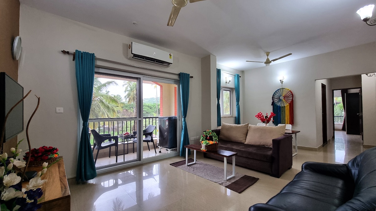 Modern Boho Apartment | Minutes from North Goa's Beaches.A cosy, fully furnished 1BHK retreat perfect for couples, friends, or small families. Highlights: - Stylish boho interiors with a warm vibe - AC in bedroom & living room for comfort - Smart TV + High-speed WiFi - Equipped kitchen with RO water, cooktop, fridge & washing machine - Shared swimming pool (9 AM–6 PM | swimwear mandatory - On-site gym available as a paid facility - 24/7 security for peace of mind - Free Parking
