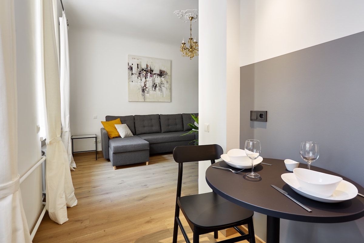 My design apartment in a renovated historic building is only a 5 minute walk from Riga Old Town. The combined living room and dining area comes with plenty of natural light. Kick back on the comfortable couch and enjoy a book or some TV if that's what you prefer. The kitchen is stocked with all the necessary cooking utensils, and an espresso machine so you can start your mornings off right. The comfortable Queen size bed in the bedroom will guarantee that your time here will be relaxing!