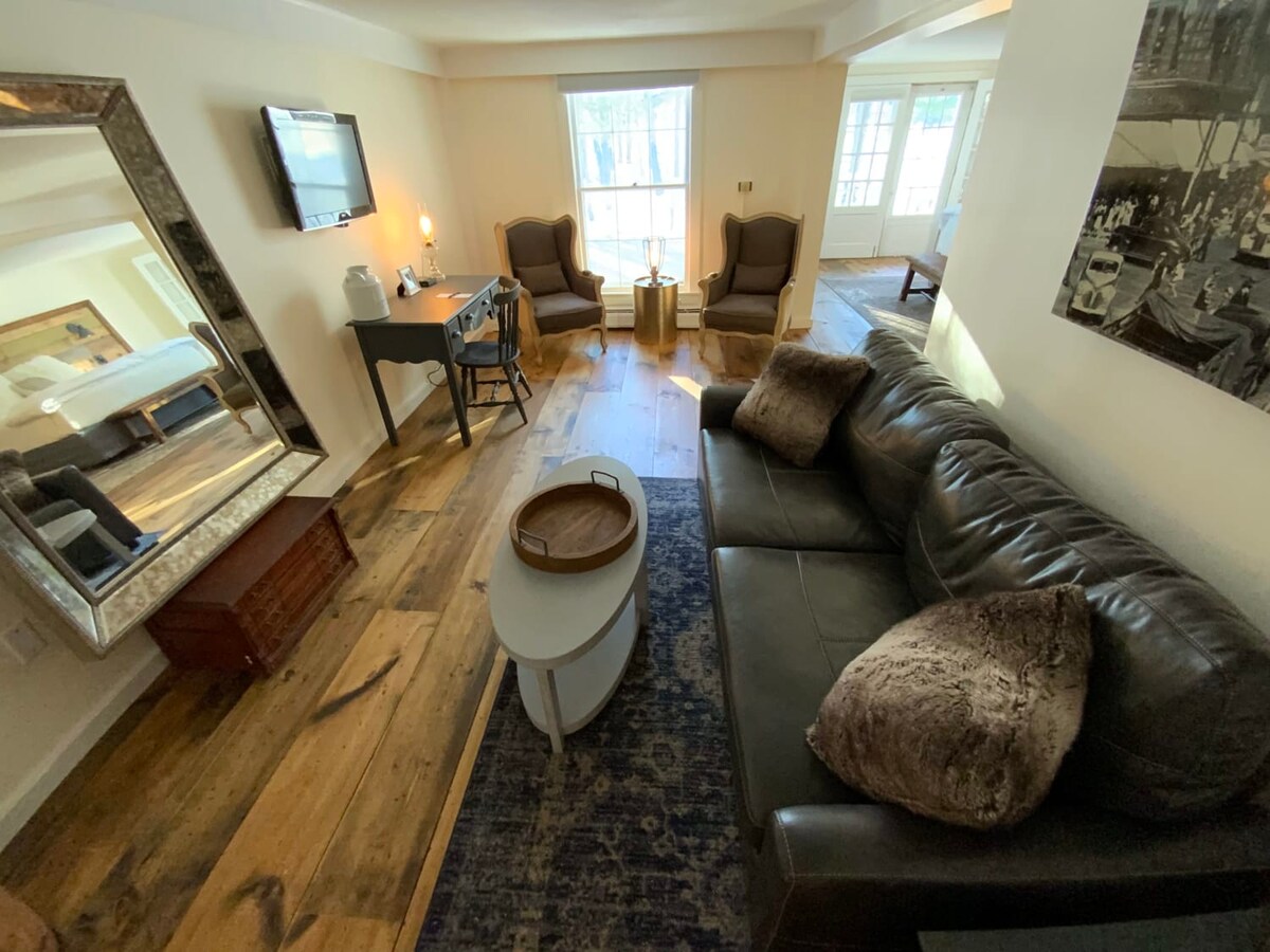 Deluxe King Suite with balcony and living room inside of our newly renovated historic Inn. King bed and a queen pullout sofa. This unit has 1 full bath with double sinks and 1 half bath. Room comes with towels, toilet paper, shampoo, conditioner, body lotion and other toiletries. The expansive balcony has a bistro set for enjoying a coffee or happy hour. This unit also has a mini fridge and Keurig coffee maker. We provide K-cups, tea, sugars and various snacks.  Inn room 1 is not pet friendly.