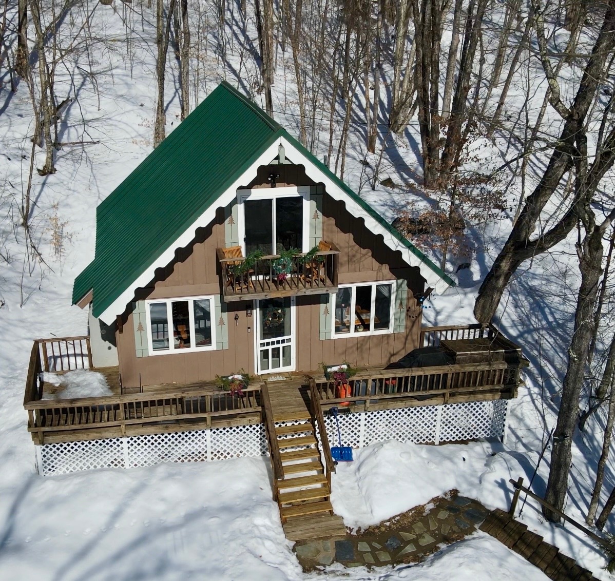 This bright, well-designed Scandinavian-style chalet is the perfect cozy retreat. Nestled in the woods on a plot of 20+ acres, it offers scenic views and a private hiking trail leading to beautiful vistas, transforming into a winter wonderland for skiing adventures, a summer paradise for outdoor relaxation, and a vibrant canvas for leaf peeping during Vermont's stunning fall foliage season. Goodland wood burning hot tub is available 365 days a year.