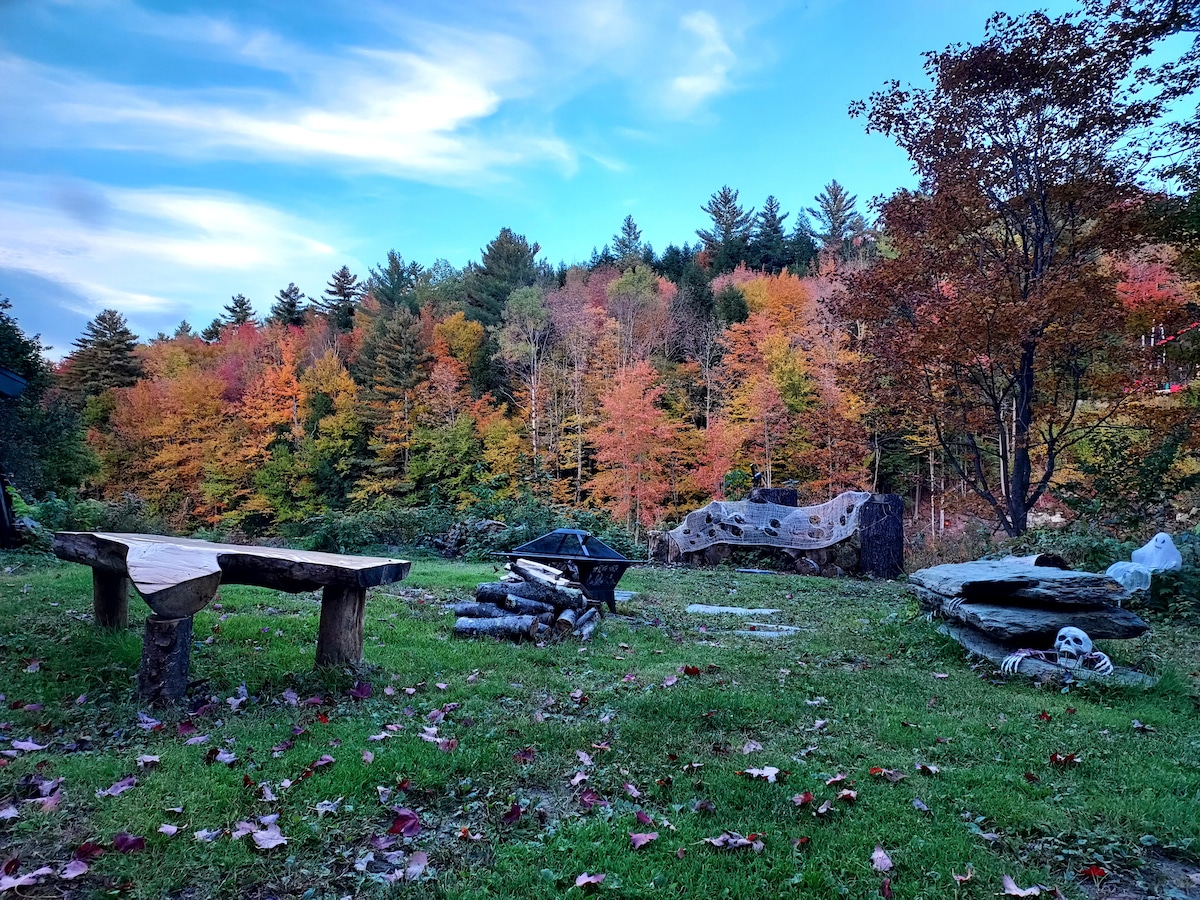 Our unique hideaway is only two miles from many restaurants, cute shops, the gorgeous Buttermilk Falls and we are 1 mile from Jackson Gore at Okemo Mountain Resort where you can enjoy mountain biking, a ropes course or skiing and riding! Enjoy 100 acres of hiking or snowshoeing right outside your door. There is nice fire fire pit, hot tub and outdoor seating. Perfect location for the outdoor enthusiast or a relaxing weekend in cool VT air!