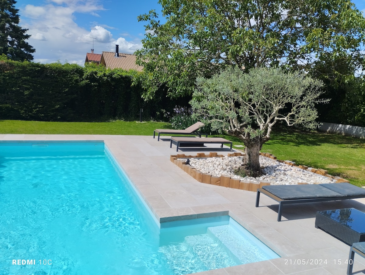 Maison Gaïa se trouve dans un écrin de verdure sur un site protégé La nature verdoyante est restée préservée sur ce secteur situé à 30km de Lyon. Vous profiterez du calme d'une maison d'architecte en bois, moderne et lumineuse. La surface totale du logement et de sa dépendance est de 300 m² La grande piscine, le terrain de pétanque et le jeu de volley vous attendent A votre disposition 6 chambres, 5 salles de bain, des terrasses, la piscine et le pool house avec cuisine d’été. Fibre 2 GB
