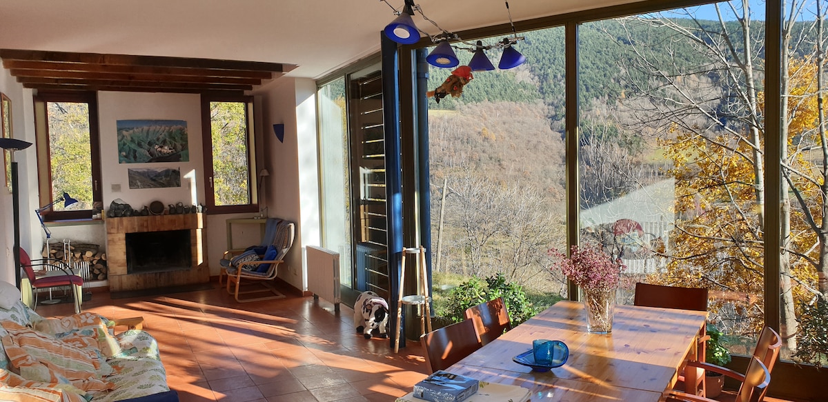 Spectacular views from a unique village house, built into the rock face. Perched in a peaceful mountain village, it's one of the sunniest locations in the area. Both the house and private garden have wonderful mountain views. The house is built into the rock and stays warm in winter and cool in summer. It is a tranquil place ideally located for walking, thermal pools, mountain biking and 30 mins drive approx from ski resorts like Font Romeu. The beautiful Carança Gorge is 12 mins drive away.