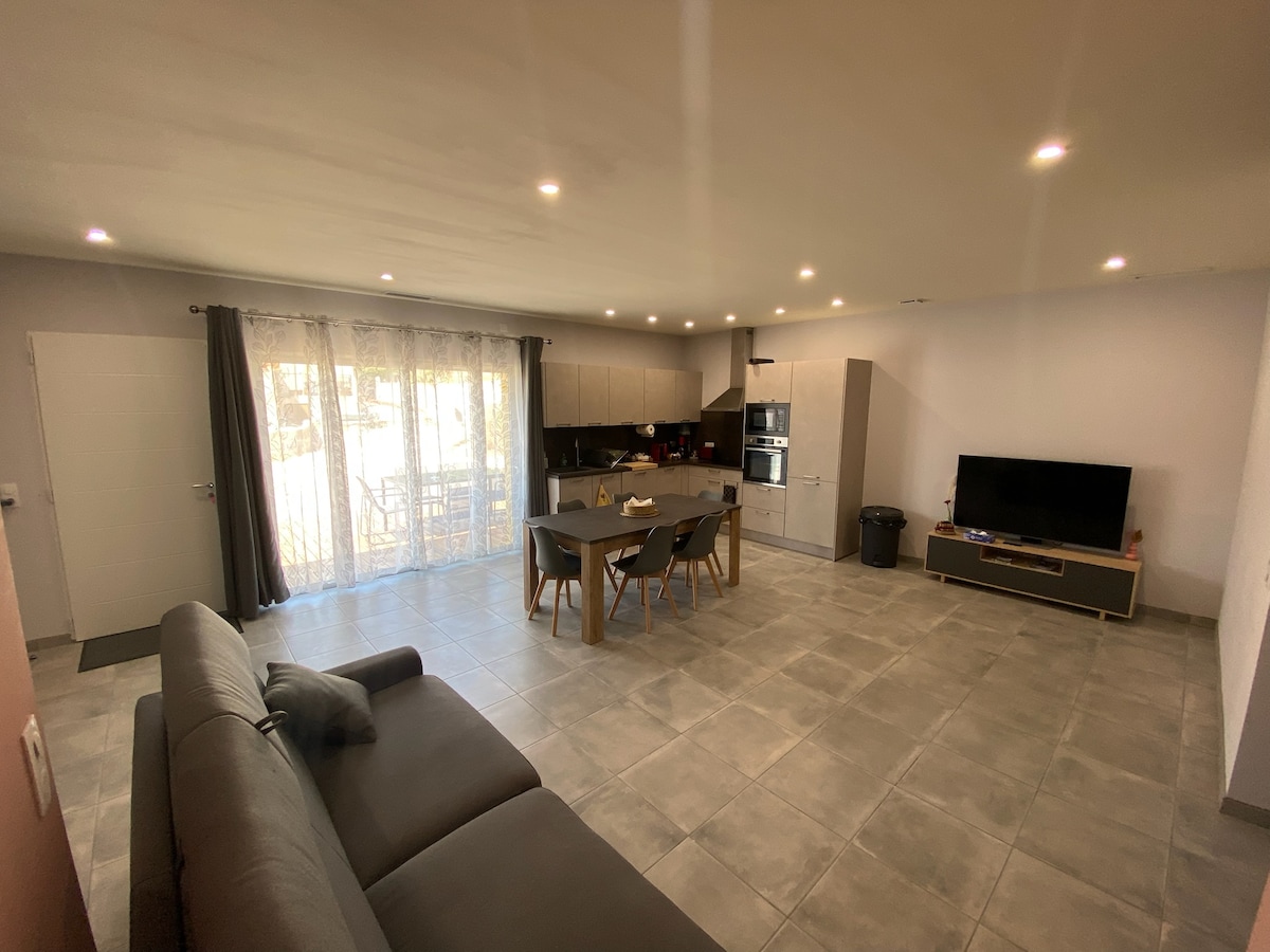 Villa récente et bien équipée 4★ de 100 m² à Saint-André, village calme au sud de Perpignan, entre mer et massif des Albères. Idéalement située pour découvrir notre région, à 10 min des plages, 15 min de Collioure et 30 min de l’Espagne. Capacité 6 personnes, 3 chambres confortables, une salle de bain et une salle d’eau, climatisation, wifi rapide, parking privé. Terrasse équipée pour repas et détente et piscine privative sécurisée. Commerces et activités à proximité, quartier résidentiel calme.