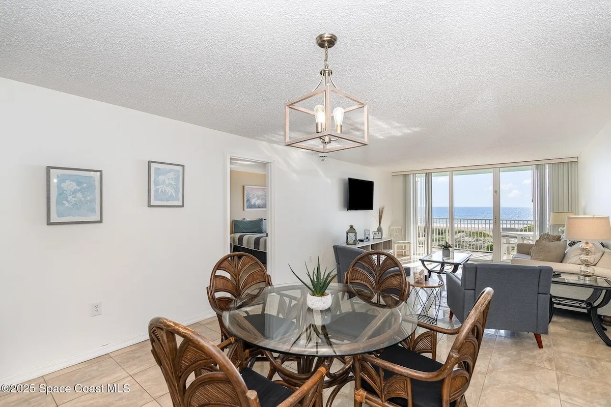 Steps from the sand! Upscale and spacious 1 bedroom, 1 bath suite. Breathtaking ocean views from every angle including triple glass slider, balcony, and oversized bedroom windows! See and feel rocket launches from the private balcony. Perfect for aquatic adventurers or close-knit friends. Tastefully appointed and newly renovated, expect an idyllic location for on-the-water fun with luxury for up to 4 guests Near Disney/Orlando Airport, Kennedy Space Center, Port Canaveral, Cocoa,Melbourne