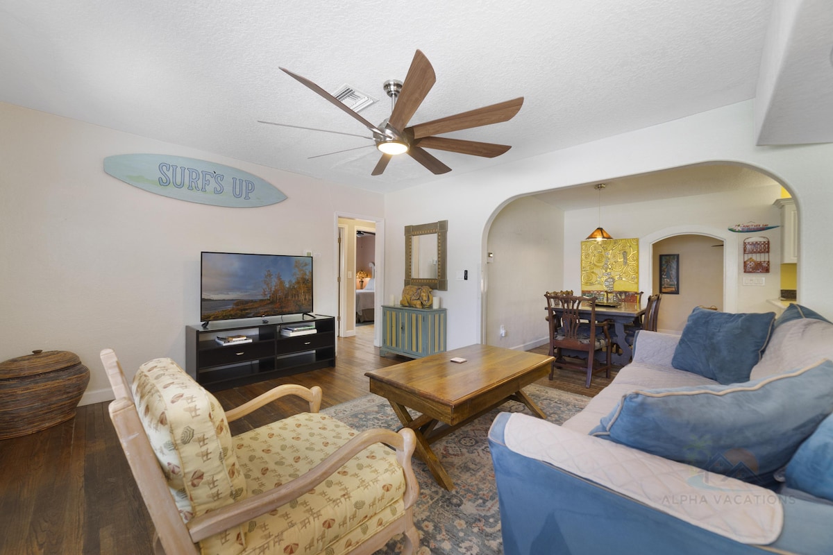 Uniquely Private Beachside Villa 2 minutes to the beach. Welcome to affordable luxury. Golf "Fun" Cart, Kitchen Inside & Spacious Private Courtyard with Summer Kitchen Outside. Private Pool with guest sundeck. Adult Bikes. Fire Pit. Private Sunbathing. Pet Friendly.Netflix. Amazon. Disney+. Cable. Drive 2 minutes to Beach, 2 minutes to River Parks, Shopping, Restaurants! Welcome to Kalena's Kabana, located on a small barrier island along the central Florida east coast. Our villa is nestled in the premier neighborhood of Melbourne Beach. Enjoy pristine uncrowded beaches, parks, bars, restaurants, and a laid back community vibe. Melbourne/Orlando Airport and Port Canaveral Cruises are minutes away from this prime location. During your stay you may simply enjoy the pleasure of relaxing here and taking short excursions around town and the beach in the golf cart, with Sunsets at Melbourne Beach Pier on the river a favorite days end. The Cart is a unique amenity to our Kabana that guests are thrilled to use. Inside the Kabana we have gone to great length to provide top-shelf amenities while anticipating your every need. Outside you have a spacious courtyard, a unique sand "beach" with fire pit, and a covered summer kitchen pavilion fully equipped to BBQ. Your outside space extends back from the courtyard along a private path to your own private wooden deck overlooking our oversized pool. Swim. Sun. Enjoy a cool drink in a lush tropical environment. Suggested activities include day trips to Orlando theme parks (one hour away), Sebastian Inlet State Park, the Kennedy Space Center (this area is named the "The Space Coast"), and so much more. Check out our guest guidebook for suggestions. Have a dog or service dog? No worries! They are invited too. Be able to verify your dog has up to date shots along with good flea treatment prior to visiting, and that they are well behaved so they can enjoy a vacation as well. We allow one or two dogs that have a combined weight less than 60 Lbs. We request your pet does not go in the master bedroom as it has thick pile blue carpet, and if you take them to the beach or on a outing that you bathe them and dry them prior to re-entering the kabana. Please email us if you wish to take advantage of the golf cart or pet lodging at host@kelenaskabana.com. This insures we are ready to serve these requests.