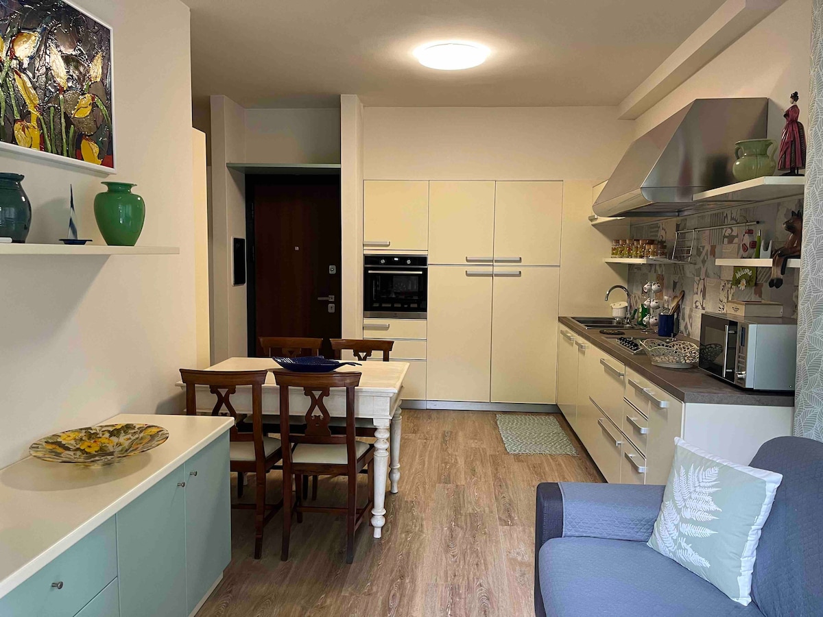 Appartamento di taglio medio piccolo collocato al piano primo. La zona giorno è caratterizzata da un piccolo angolo cottura, un tavolo con sedie quale zona pranzo ed un soggiorno con divano letto, Smart TV ed accesso al balcone arredato con sedie e tavolo. La zona notte invece è composta da una camera matrimoniale separata dal bagno tramite un piccolo disimpegno. L’appartamento è provvisto di riscaldamento e climatizzatore sia nella zona giorno che in quella da notte.
