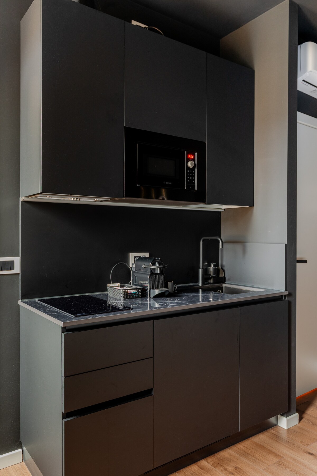 Just steps from the city center, this luxury black studio features a modern bathroom with marble-inspired finishes and a walk-in shower. Perfect for couples or business travelers, with elevator access and a unique, intimate design. ____________________________________ IMPORTANT: A TOURIST TAX OF 3.50 EURO PER PERSON, PER NIGHT, WILL BE COLLECTED UPON CHECK-IN. WE KINDLY ASK FOR COPIES OF YOUR ID DOCUMENTS BEFORE YOUR ARRIVAL.