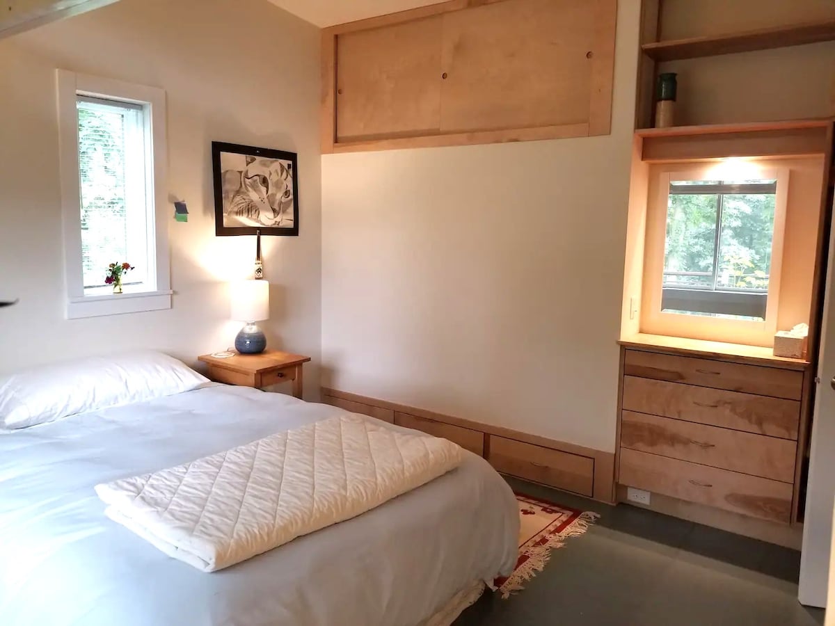 This architect-designed studio is bathed in natural light, with skylights and a breakfast nook with a wrap-around window. Featuring an upscale bathroom with a walk-in shower, this comfortable space has all the amenities perfect for a quick weekend getaway or a week-long business trip. The studio adjoins a house and is up a flight of stairs through a separate outdoor entrance. Located just up the hill—a 5-minute walk—to Downtown Middleton and a 15-minute drive to UW and Downtown Madison.