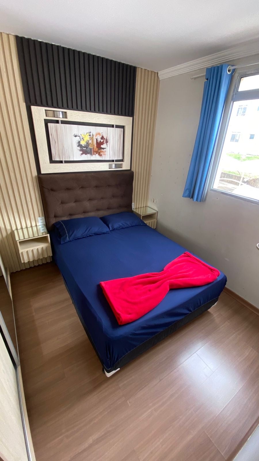 Apartamento mobiliado com 2 quartos e 3 camas (1 casal e 2 solteiro). Cozinha completa com micro-ondas, cafeteira, sanduicheira, utensílios, geladeira e fogão. TV, Wi-Fi e ventilador de teto. Condomínio com vaga de garagem, playground, churrasqueira, mini mercado e portaria 24h. Localizado próximo ao Aeroporto de Confins, Cidade Administrativa, Cidade do Galo e shopping. Região tranquila, segura e de fácil acesso.