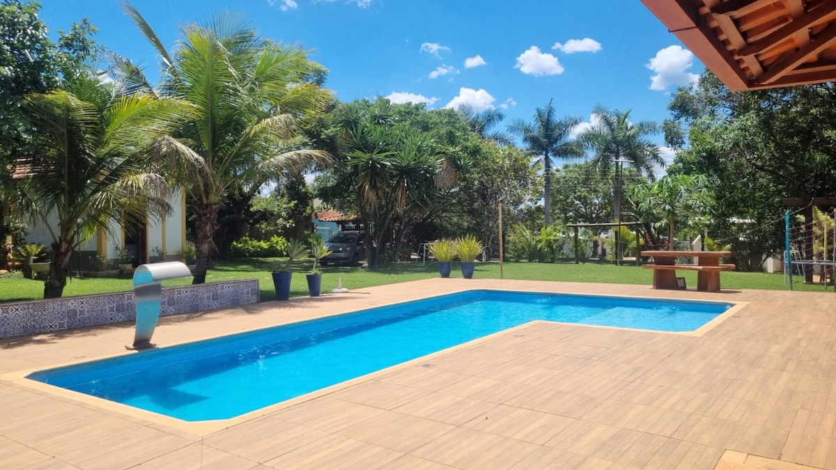 🌴ACONCHEGANTE - Condomínio fechado - Segurança, ideal para famílias e pets! Aproveite dias ensolarados com piscina particular aquecida, churrasqueira, fogão a gás, lenha e forno iglu. A casa possui 3 quartos (1 suíte com jacuzzi e ar-condicionado), 3 banheiros, lavabo, cozinha equipada, Wi-Fi. A decoração rústica e acolhedora tem o toque de mineiridade. Jardins, quadra e piscina iluminada garantem o cenário perfeito para relaxar, se divertir e viver momentos inesquecíveis em meio à natureza.