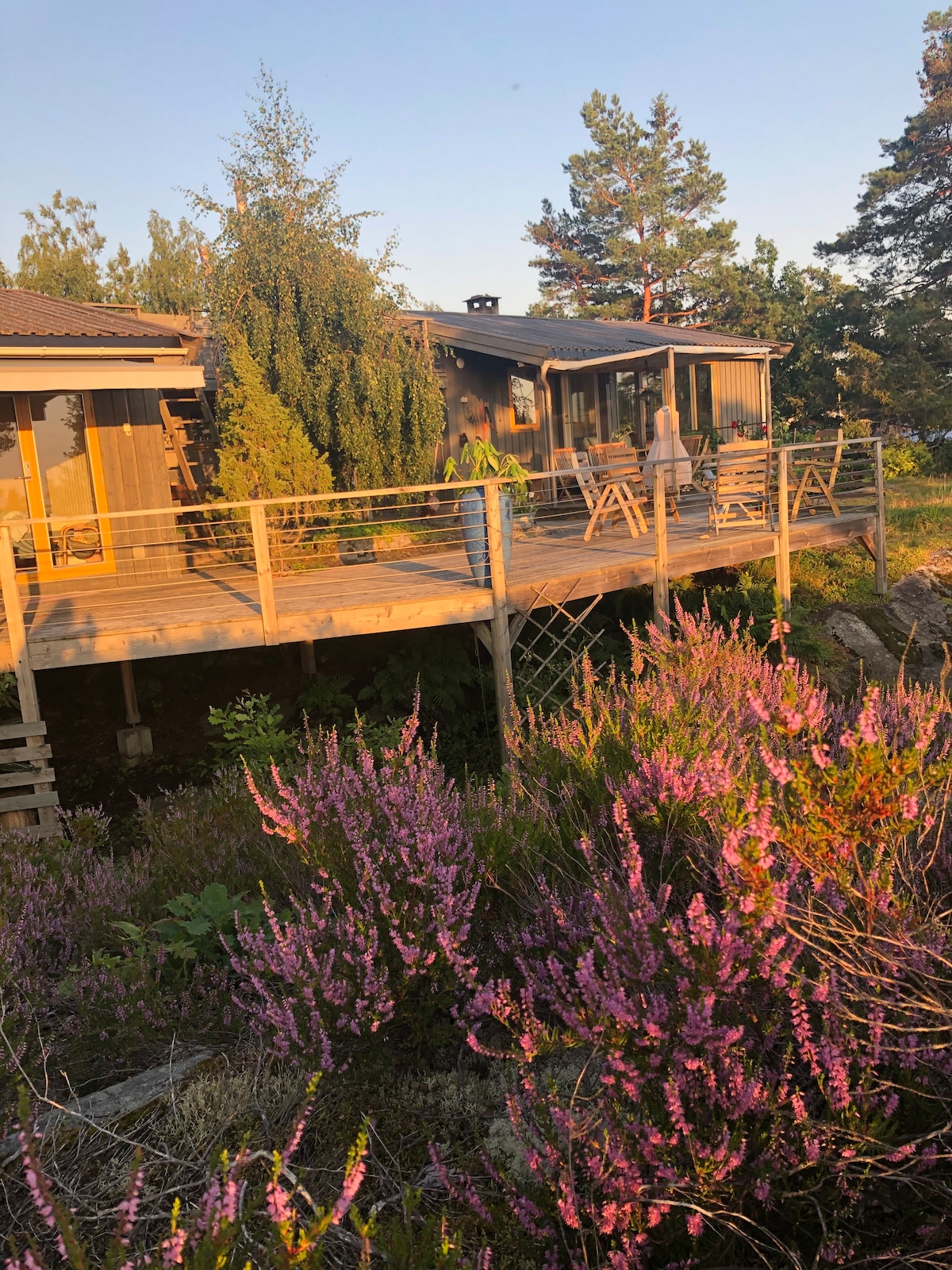 Nyt magiske sommerdager på Toppen av Son med spektakulær utsikt over Oslofjorden. 180 grader sjøutsikt fra golfbanen i Son i nord til Moss havn i sør. 5 min å gå til strand i begge retninger. 20 min å gå til sentrum av Son med flotte restauranter som Sjøboden og Kull. Butikker og iskiosker. Uteliv på Oliven og Hagestua. Galleri Soon. Terrasse og gressplen blandet med naturtomt. Utedusj med flott utsikt. Ett soverom med dobbeltseng og uttrekkbar dobbeltseng i stue. Lite og sjarmerende.