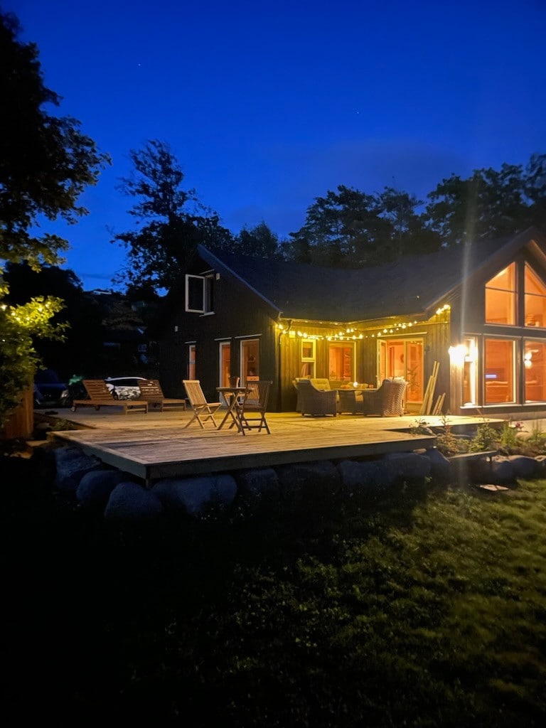 Arkitekttegnet designerhytte med utsikt til sjøen.