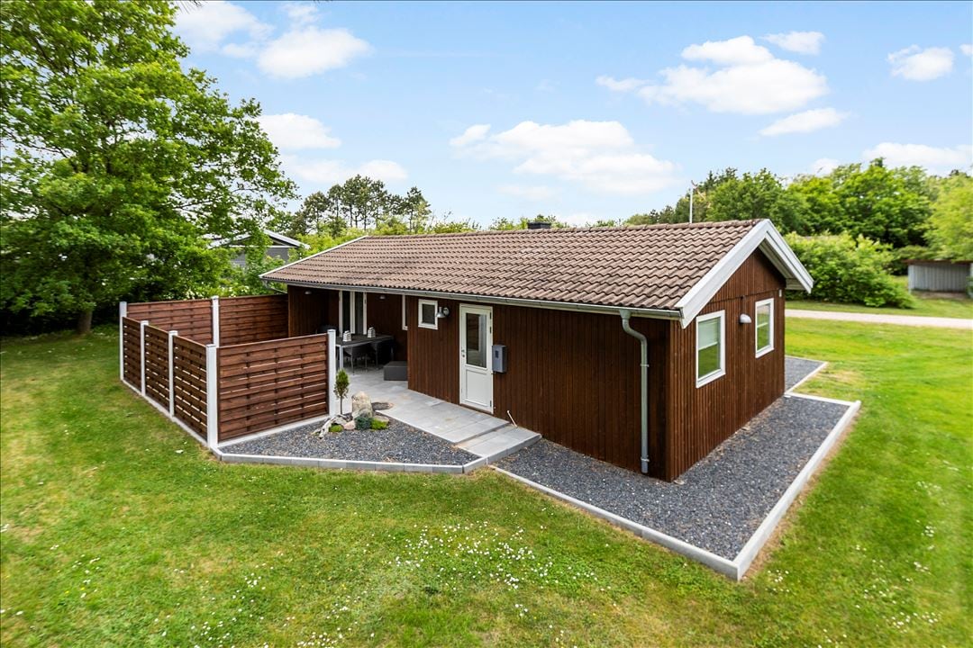 Nybygget sommerhus fra 2022 på 125m2, udsigt til vandet, 4 værelser, hems, stort køkkenalrum, hævet stue, et toilet og et stort badeværelse med spa. 70 m2 terrasse, noget hævet og gode siddepladser mod både øst og syd og Webergrill til rådighed. Stor grund på 2500m2, med træer omkring, som sikrer god læ. Naturskønt område med badestrand, campingplads og legeplads med en lille kiosk. Indkøbsmuligheder indenfor 7 km. Forbrug aflæses ved ankomst og afregnes ved afrejse. 5 DKR pr. Kwh. Vand inkl.