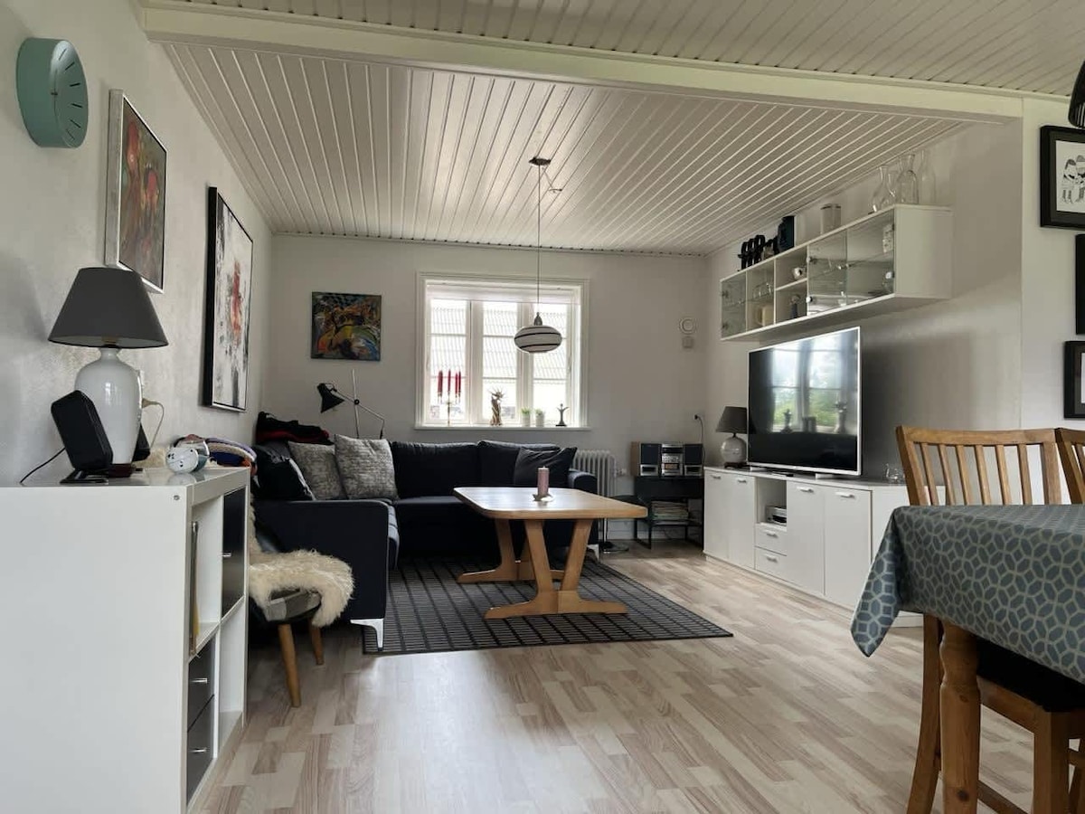 Super hyggelig lejlighed på ca. 80 M2. Boligen indeholder helt nyt køkken med spisebord. Stort nyt badeværelse. Soveværelse med dobbeltseng og stor stue med sovesofa. I alt 4 sovepladser. Fra stue og køkken er der udsigt til haven, åen og ådalen. I direkte adgang fra stuen har du egen terrasse med grill.Køkkenet er udstyret med basisprodukter.