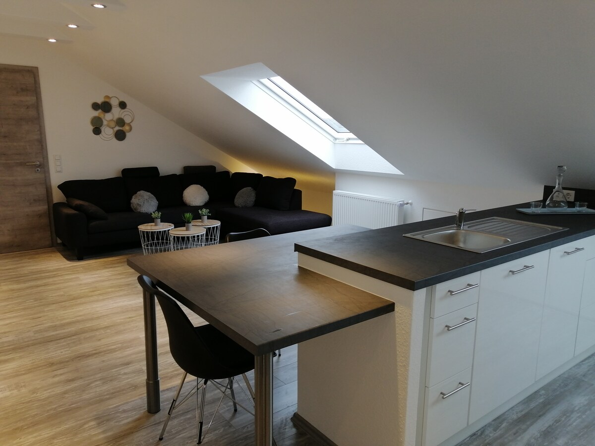 Entspannt euch in unserer besonderen und ruhigen Unterkunft! Das neu eingerichtete Apartment für bis zu 4 Personen mit ca. 60 qm verteilt sich auf zwei Etagen. Hervorzuheben sind eine vollausgestattete Küche, TV, Schlafcouch, große Panoramafenster, ein gemütliches Boxspring-Bett, die eigene Terrasse mit Außenbestuhlung sowie ausreichend Kundenparkplätze. Das Panoramafenster der Ferienunterkunft ist Richtung Sonnenaufgang und Wald ausgerichtet. Wir freuen uns auf euren Besuch!