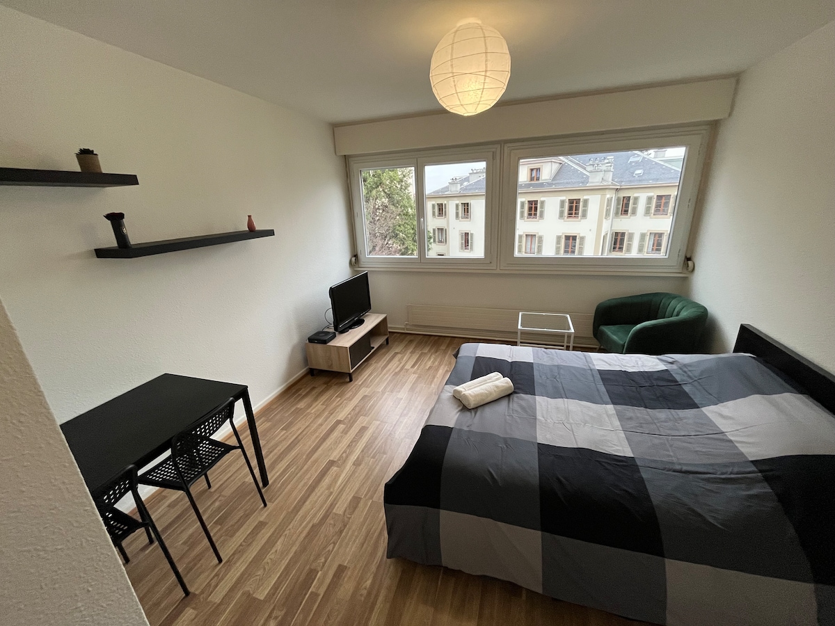 Best area in town. Calm, safe while 2 mins walk from supermarkets, pharmacy, restaurants and underground. 5 mins walk from the hospital. Parc 3 mins away. Bus n.3 to the train station and plenty of bus stops connecting all Geneva. Our studio will be your home! It is composed of a separate entrance and kitchen, in a unique space there is a doible bed and a sofabed. Parking places available in the street for the entire night or 90 min stay during the day. Payable parking a few meters away.
