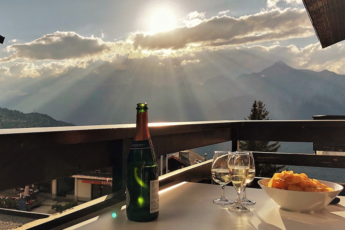 Absolute Dream Location! 1450 m Altitude! Best view in Switzerland! Best value for money! Huge ski area (4 Vallée / Verbier) : 400 km+ of pistes. Ski Lift at 3 minutes walk! For 2 Families = 4 bedrooms, 2 bathrooms! In Center: Restaurants, Bars and Supermarket across the street! Own Free Parking! Free coffe! Surreal panorama both at day and night to enjoy from the living room and Garden: Mountains, Glaciers, Lakes, Valleys, River, Airport, Highway, Railway, Church, Vineyards, City, Villages