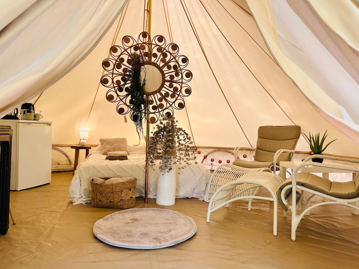 Luxury glamping safari tent with private wood‑burning hot tub in Corréze countryside. Set on a small, exclusive campsite with just a few tents, each with space and privacy. Perfect for a romantic getaway yet family-friendly thanks to the open layout and private pitches. Experience a calm, boutique atmosphere, enjoy stunning countryside views, and savor a truly personal and elevated camping experience with thoughtful, comfortable touches for unforgettable stays.