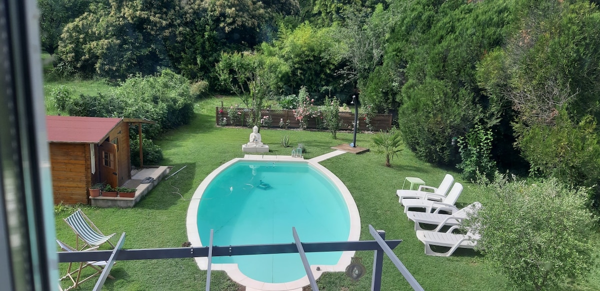 The two rooms flat we let is part of our home close to the swimming pool (you can have a swim or lie down in the sun in the morning and after 4pm in June, July and August). We've got a cat and dog who love company. We live in the country but close to Gramat (shops and restaurants) and to Rocamadour , Padirac, and not far from the Dordogne valley. (Sarlat...) We will be happy to entertain people from any country (Claudine is a former English teacher and loves meeting English-speaking people).