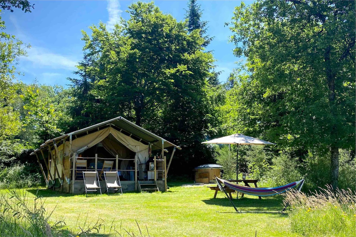 Tente Glamping au bord de l'étang – Nature, confort & déconnexion Terrasse privée • Cuisine équipée • Accès à pied • Envie de vous déconnecter dans un cadre paisible sans renoncer au confort ? Bienvenue dans notre tente glamping spacieuse et chaleureuse, perchée sur une terrasse en bois au bord de l'eau, en pleine nature, avec jacuzzi. Située sur notre domaine Les Secrets de la Nature, au cœur du Périgord Vert , cette tente est parfaite pour une escapade en couple, en famille ou entre amis.