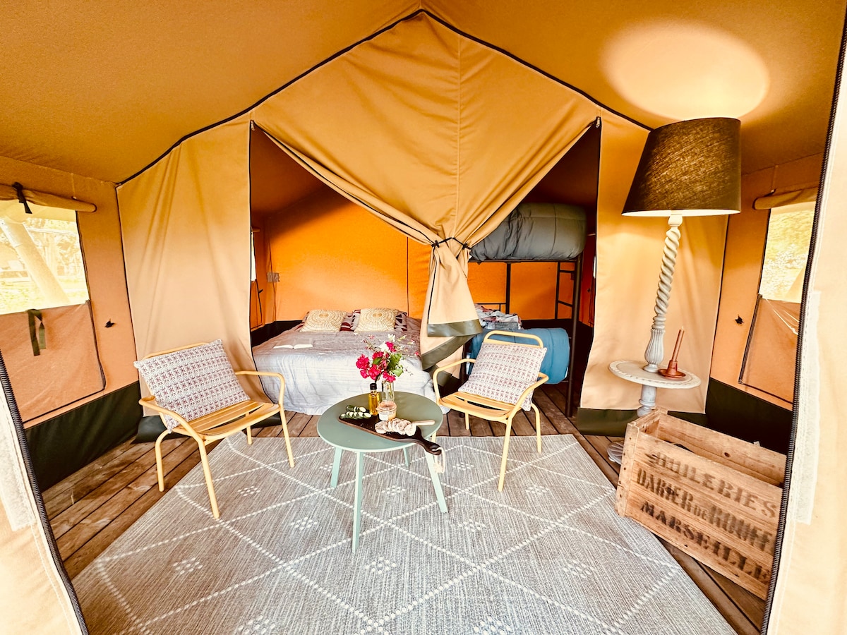 Besoin de vous reconnecter avec la nature dans un site d’exception en Dordogne ? Notre tente lodge type "Out of Africa" tout confort est faite pour vous ! Conçue pour faire de votre séjour une expérience inoubliable, seul, en couple ou en famille jusqu’à 6 personnes, dans un camping **** de 12ha avec accès piscine et jacuzzi ! Deux chambres (literie de qualité), salle d’eau avec WC, cuisine tout équipée et grande terrasse abritée avec salon lounge, table de pique-nique et bains de soleil.