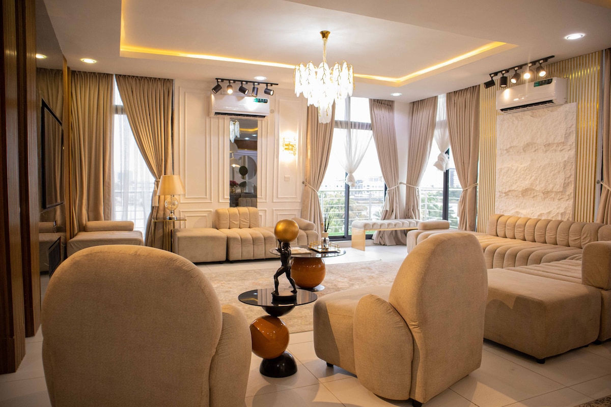 Welcome to our luxury oasis in the heart of Ikoyi, blending sophistication with exclusivity. Our apartment’s a safe space perfect for new visitors to Lagos as well as returnees who are re-experiencing the city. Perfectly located, you're only minutes from everywhere fun - Victoria Island, Banana Island, Admiralty. Experience unparalleled living in our spacious lounge, equipped with a sleek TV and comfy couch. The bedroom boasts a plush king bed, marble-inspired wall, and ambient lighting.