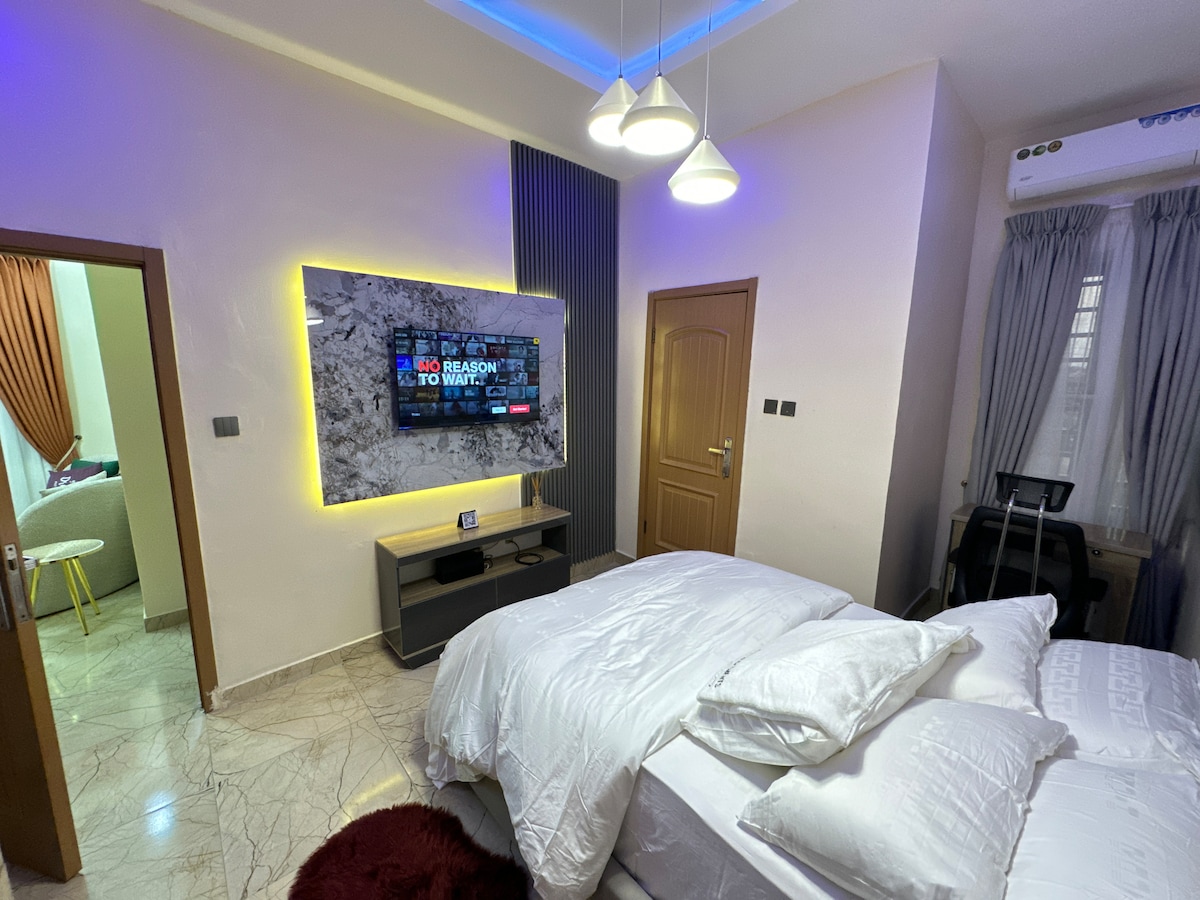 -New and fresh -24 hours power supply -Gym -PS5, unlimited and fast Wifi, Amazon prime, Netflix and dstv -House Keeping -Secured and serene estate -Clean water -spacious balcony -very close proximity to Leisure sports Park(basketball, football, long tennis and paintball) No get together or parties allowed( 2 guests max)