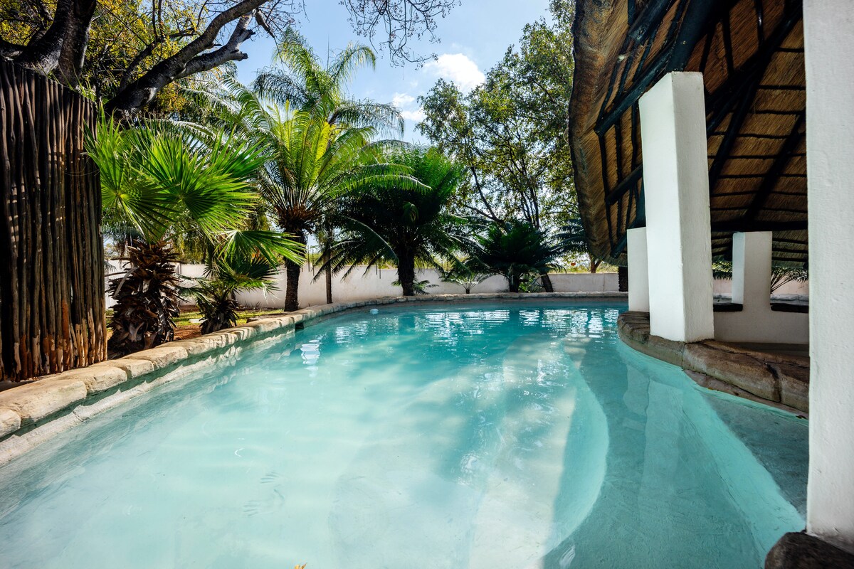 Perfect place to enjoy your peaceful stay, enjoy the sound of birds, breezing trees and river flow view. Indulge in natures best, with our outdoor bush bath tub and outdoor shower. Private pool, boma and braai area We have a fully equipped kitchen, offering self catering, with an option of private chef.