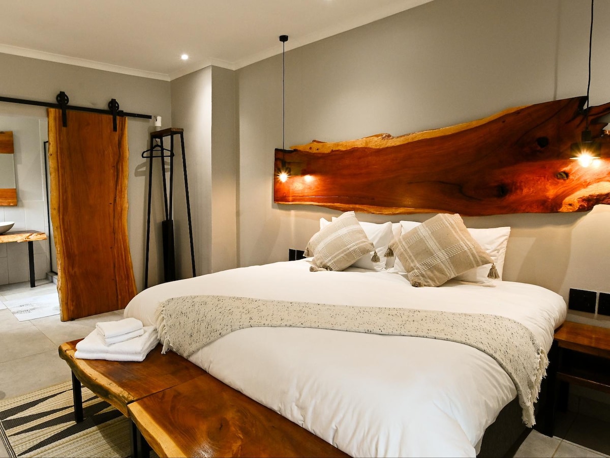 Standard King Room - Private en-suite bathroom with shower and bathtub. Small kitchinette - Uncapped Wi-Fi - DSTV OVHD/ Satelite TV (not full DSTV package) - Aircon - Outdoor braai area with braai facilities (one bag of wood supplied)