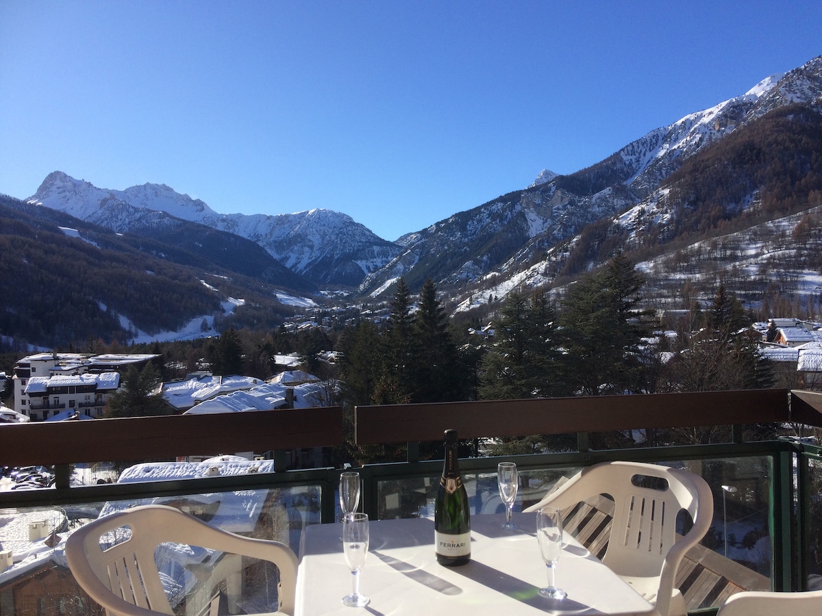 Très bel appartement vue imprenable, idéalement situé à 5 minutes de la station de Chantemerle et 5 minutes du centre de Briançon et de la télécabine du Prorel, dans un chalet typique briançonnais. Entièrement rénové avec goût et dans une ambiance "montagne", vous serez séduits par son calme et son confort. Literies neuves, nombreux rangements, chemin éclairé le soir. Proche de toutes commodités, il bénéficie d'une entrée privée, place de parc extérieure, arrêt bus moins de 200m. Ménage inclus.