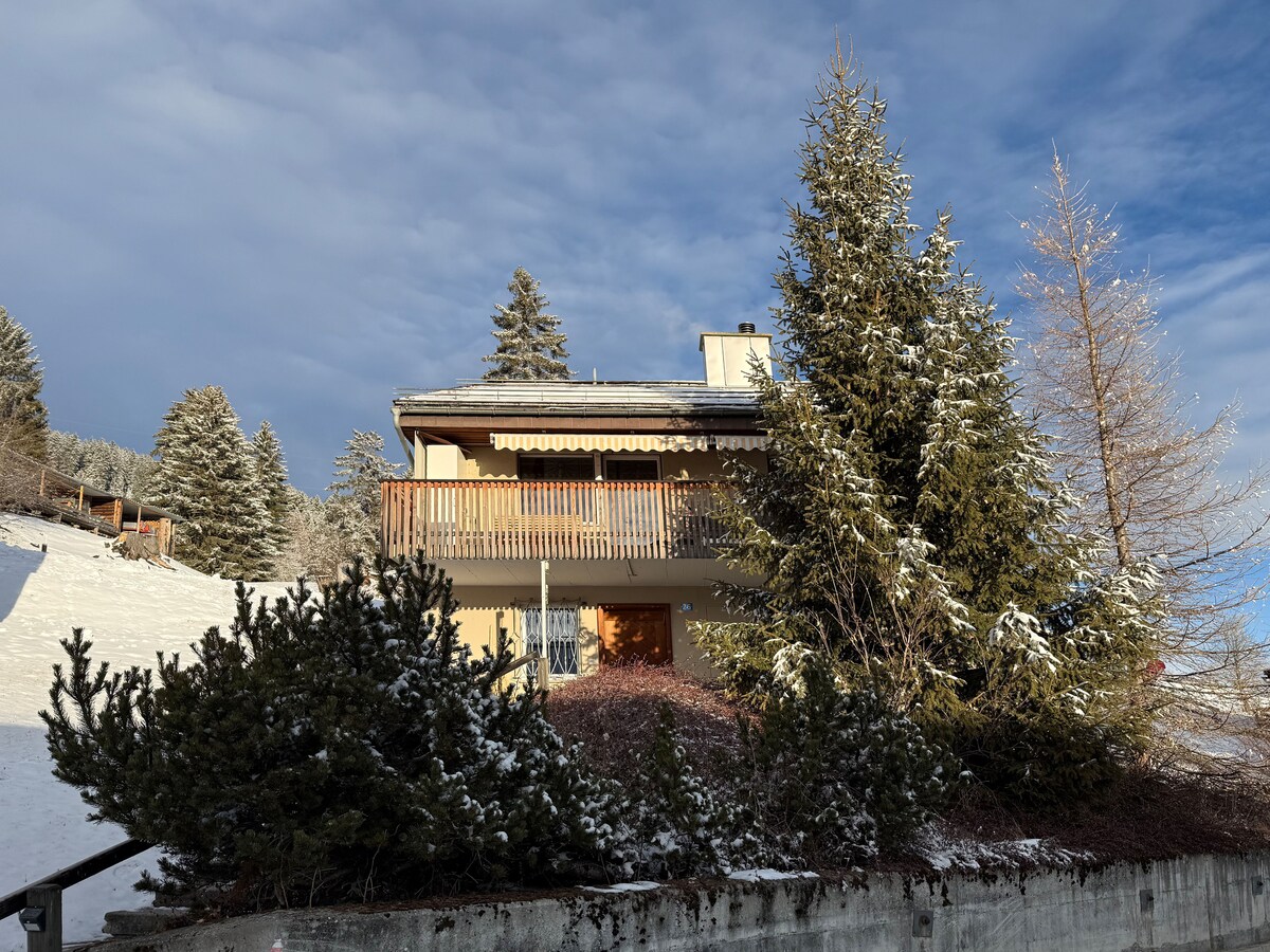 Das Chalet steht am Hang für sich allein auf einer großen Wiese weniger als 1000 Schritte vom Dorfzentrum entfernt. Wenn ihr alles nutzt, habt ihr komplette Ruhe, eine Aussicht nach Süden auf Berge von Osten bis Westen und alle wichtigen Anlaufpunkte ganz in der Nähe: Einkaufsmöglichkeiten für Dinge des täglichen Gebrauchs, die Sessellift-Talstation von Falera in die Weiße Arena und Restaurants. Der kostenlose Dorf-Shuttle hält direkt vor dem Haus und die Skipiste reicht bis fast zum Haus.