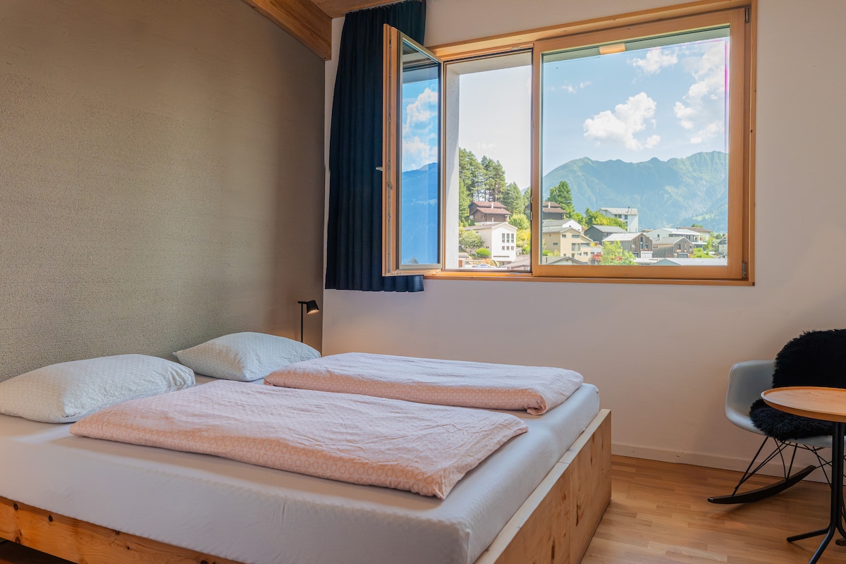 Berglodge mitten in den Schweizer Alpen. Bei uns schläfst du in Zimmern mit Lärchenholzboden und Wänden aus natürlichem Lehmverputz. Die Doppelzimmer sind mit 30m2 grosszügig und laden ein zum Verweilen. Ein Sofa bietet sich an zum Entspannen und von den zahlreichen Fenstern hast du einen atemberaubenden Blick in die Bergwelt. Am Morgen erwartet dich ein Frühstücksbuffet mit selbstgemachtem Brot, Käse aus der Region und vielem mehr.
