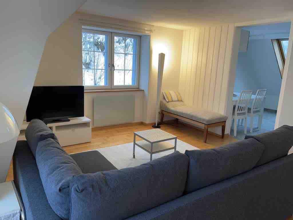Neu renovierte Wohnung in Mehrfamilienhaus. Küche, Wohnzimmer mit Balkon, Schlafzimmer, Dusche mit WC und separatem WC, sehr hell und sonnig, mitten in den Gebirgen, in einer kleinen Stadt am Rhein. Keller mit Waschmaschine und Abstellplatz für Ski, Velo, Kinderwagen oder sonstiges, Parkplatz vorm Haus. Kinder und Babystuhl vorhanden, kleine Haustiere auf Anfrage. Skibus , Freibad, Kinderspielplatz in unmittelbare Nähe.