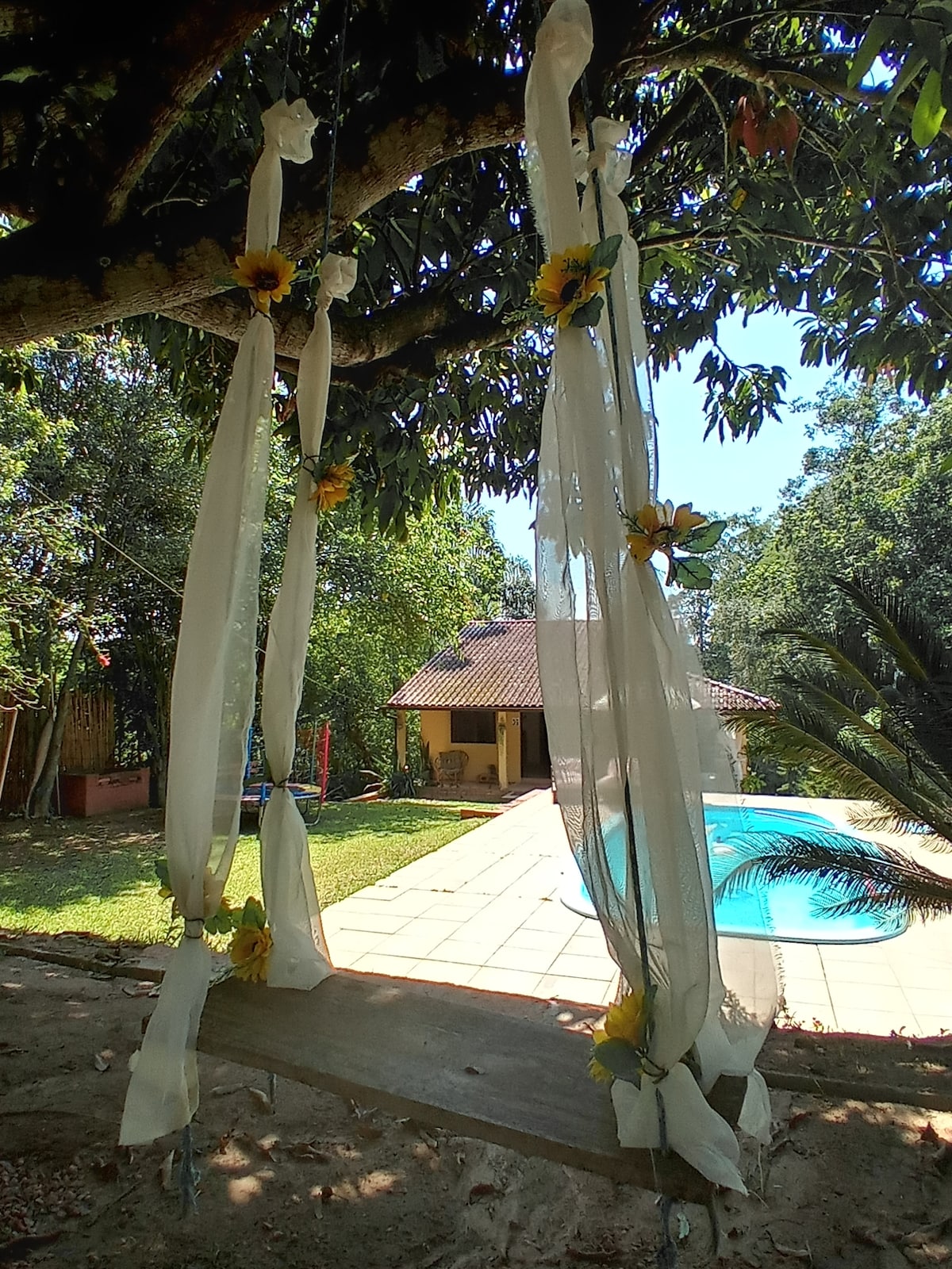 Duas casas completas com acomodações, espaço de jogos, espaço kids, área coberta aberta, quiosque e piscina. Na área coberta temos churrasqueira com mesa de jantar para 12 pessoas. Temos pratos talheres e copos para até 30 pessoas. Duas cozinhas completas. Maquina de lavar roupa, maquina de secar roupa, ar condicionado em todos os dormitórios e nas salas de estar. Freezer horizontal e três refrigeradores. Muita natureza 3 hectares para você usufruir.
