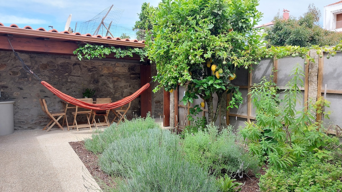 Beach, sea, mountain, garden and organic vegetable garden, large room with complete bathroom and kitchen (induction hob, mini-fridge, extractor hood, electric kettle, microwave, toaster, etc.), wi-fi and television. 200 meters from the white sand beach (Blue Flag) of Forte do Cão (Gelfa), in a calm and peaceful environment, with a huge garden and organic vegetable garden. Capacity 3 people. Yoga and Surf teacher and producer of organic vegetables. Surf and Yoga classes available.