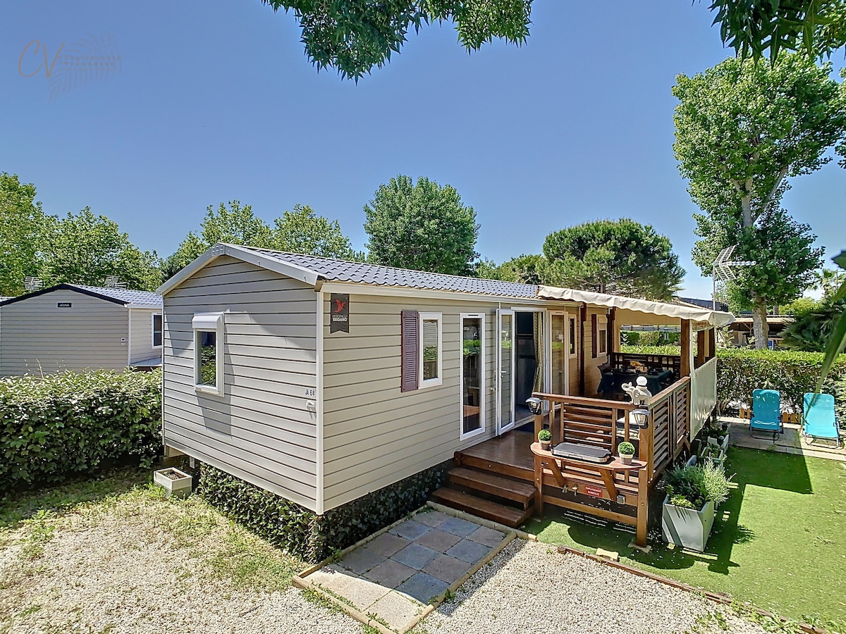 Beautiful brand-new 41m² mobile home with reversible air-conditioning, in a prime location at La Carabasse campsite with waterpark at extra charge. 1 km from the Canal du Midi and Vias beach.