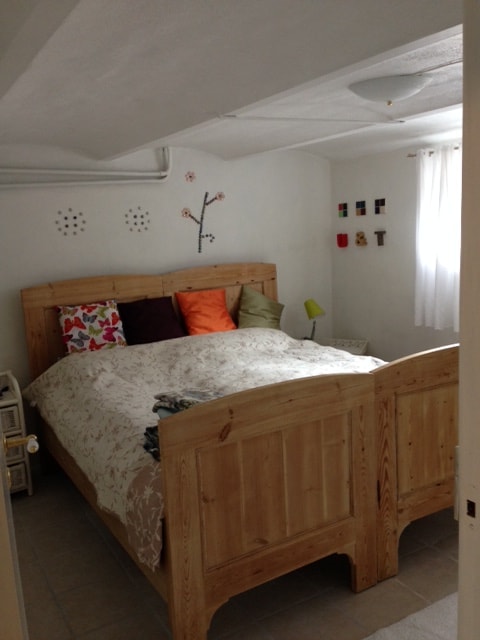 Cosy guest house, which is an independent building on the old school . The flat is 51m2 and has a lovely south-facing private 28m2 terrace. Combined kitchen and living room, a toilet/bath, an entry hall and a bedroom with one queen size bed and two bunk beds. The terrace is furnished with garden furniture, and there is wifi, tv, cromecast and parking near the entry door. Two extra beds can be made in the living room. Bonfire hut, tarzan track, hammocks and a large garden with playground.