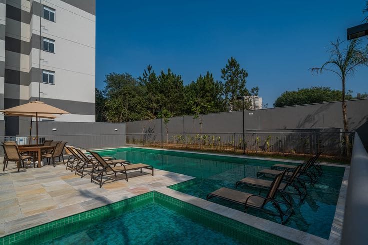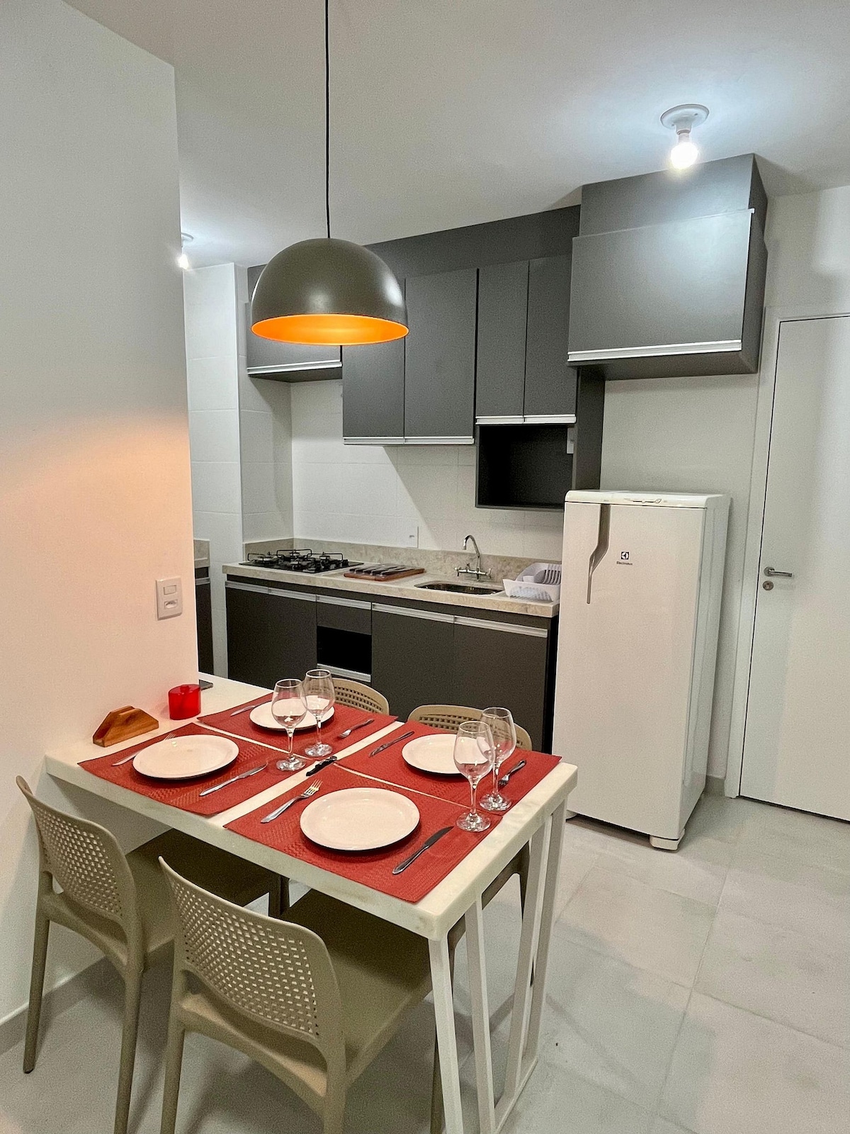 Apto completo, 34m2, novo, com Wi-Fi, 02 quartos privativos, camas de casal, ventiladores e armários. Cozinha equipada com utensilios e eletrodomésticos. Sala com sofá cama, Tv Smart 32" e mesa com 4 cadeiras. Condomínio possui lavanderia, piscina, academia e mercado para compras pontuais e facilitar o dia a dia. ATENÇÃO: NÃO POSSUÍMOS VAGA DE GARAGEM! Existe a opção de estacionar o carro na rua (tem uma base policial na rua do condomínio) ou no estacionamento Green Park, a 200m do condomínio.