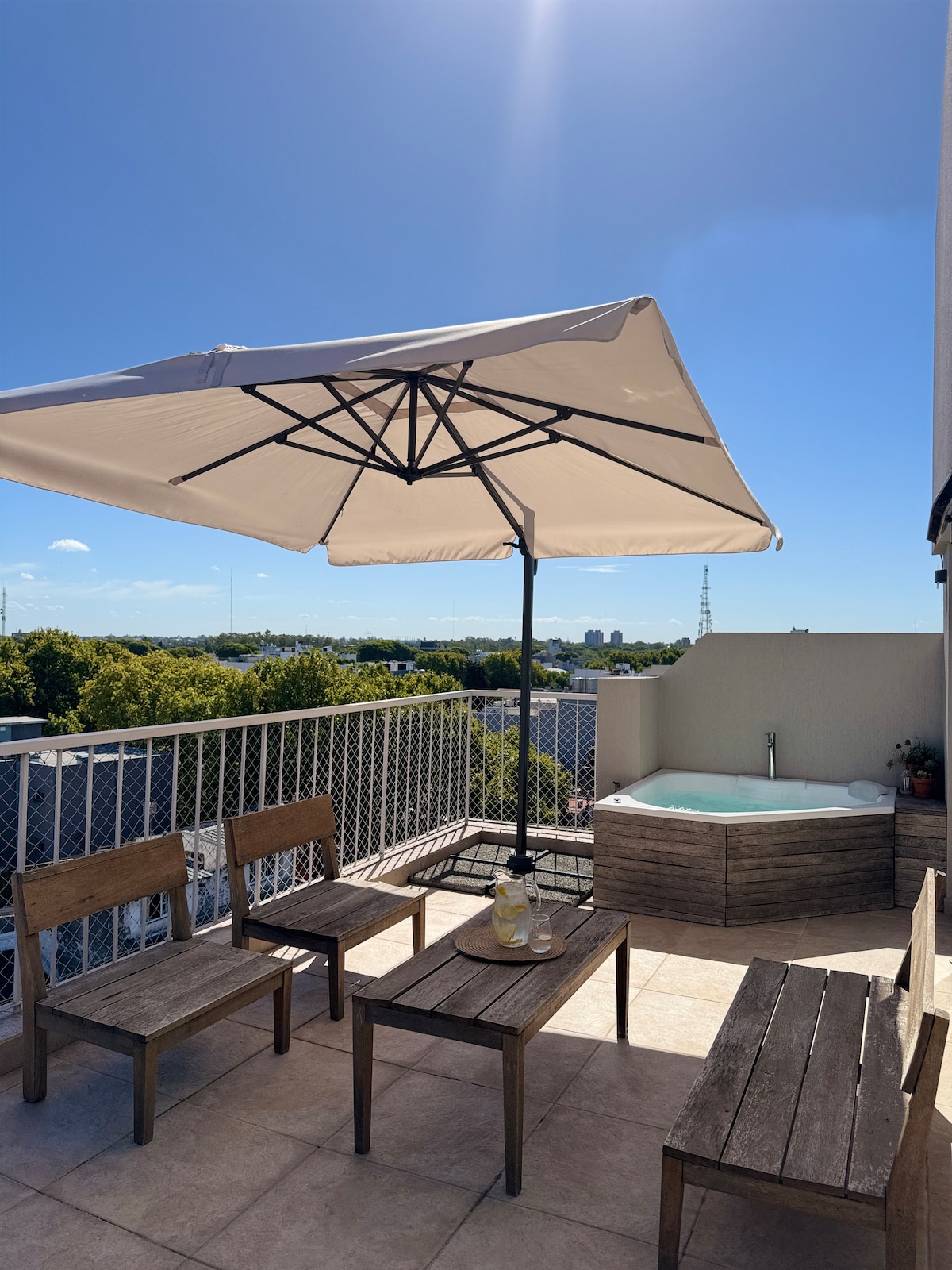 Unique three-level apartment in Núñez, featuring modern design and exclusive details. It offers two bedrooms, a dedicated workspace and fitness equipment. The living and dining area features open views and a green balcony, perfect for relaxing. Full bathroom and guest toilet with ample storage. The highlight is a private rooftop with grill, outdoor dining area and jacuzzi, ideal for enjoying privacy, sunsets and special moments.