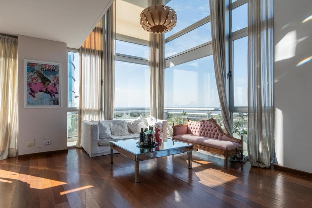 Distinguished, luminous and warm duplex, with panoramic view to the Rio de la Plata. Thought and designed for you to enjoy a spectacular experience. The reception is spacious and comfortable, in the master suite you will rest in a king size bed and the second bedroom has a double bed and a single bed and private bathroom. You will be able to enjoy the gym and swimming pool of this exclusive complex. Parking with additional cost. Located a few meters from the entrance to the city of Buenos Aires.