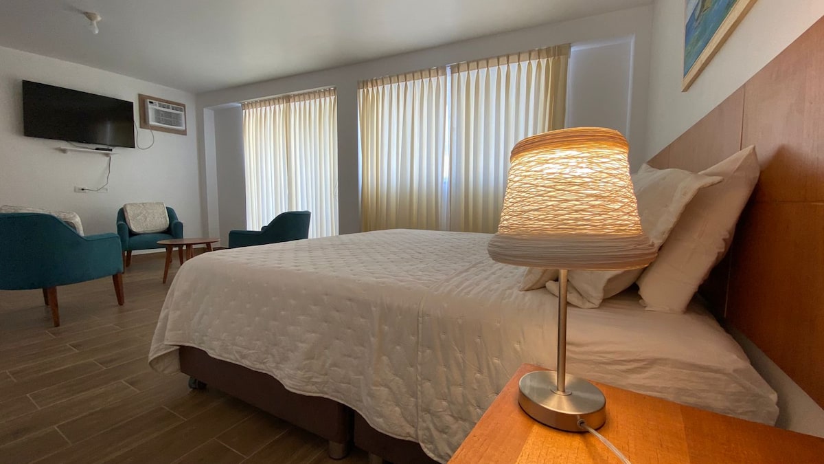 Habitación Matrimonial Standard con Cama de 2 plazas, Aire Acondicionado, Baño Privado con Ducha con Agua Caliente, Smart TV 32" con cable, WiFi, Repelente Eléctrico, Ropa de Cama y Toallas Blancas. Además, puedes disfrutar de nuestras áreas comunes, poltronas, hamacas, terraza, parrilla y mini gym, estamos a sólo una cuadra de la playa.