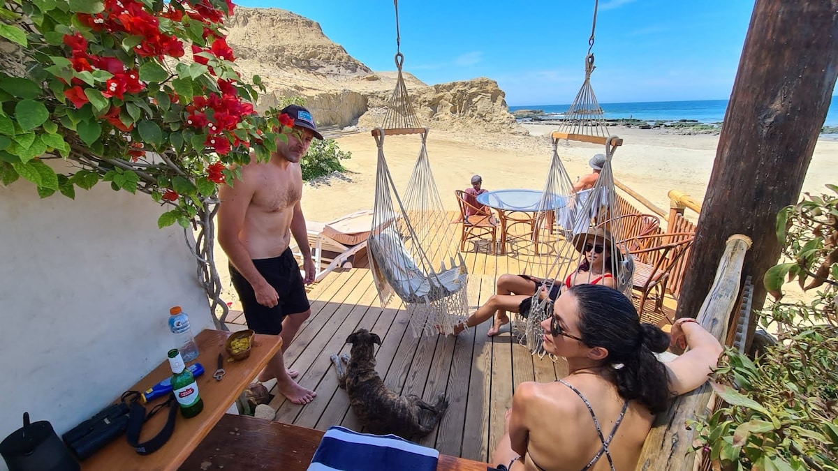 La Casa del Ñuro es un hospedaje en la playa, con dos bungalows situado en la reserva natural El Ñuro, playa privada. Desde la terraza se ven los cerros y la preciosa bahia,disfrutar del avistamiento de ballenas y nado con tortugas. Aqui te relajas, tomas sol y se puede ver el paso de las ballenas y las aves migratorias.Desde tu bungalow tienes salida a la playa. Un lugar unico para personas que buscan inspiración, tranquilidad, naturaleza. Tenemos una camita extra por bungalow para un hijo.