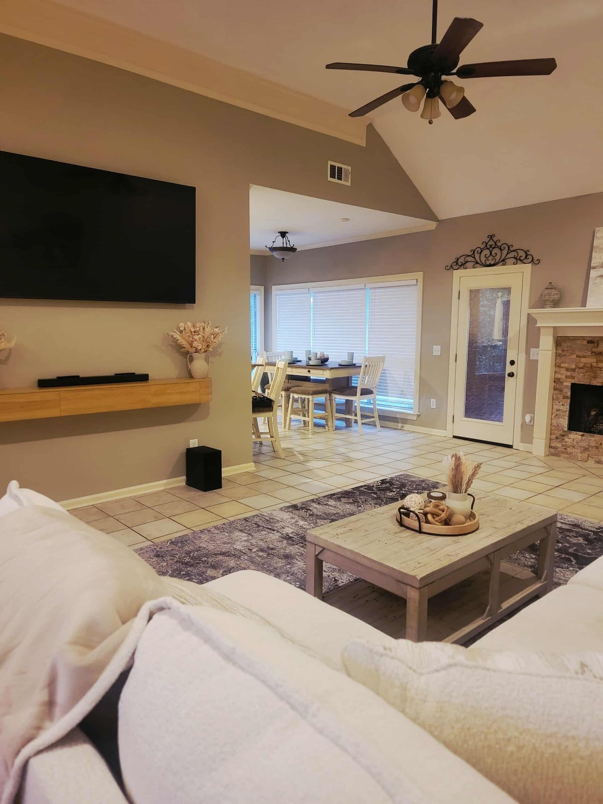 3 bedroom, 2 full bath , attached carport, sundeck , gas fire pit and screened porch with a double fans dining area. We book by the number of guest so that a party of 1 does not have to pay for a party of 7. Great location pet friendly with nice yard. Public park one block away. Sports force park, outlet mall, grocery stores, dining and shopping all within five min drive . Fully stocked kitchen . Clean, comfortable linens and furniture. Sunday check in times may vary.