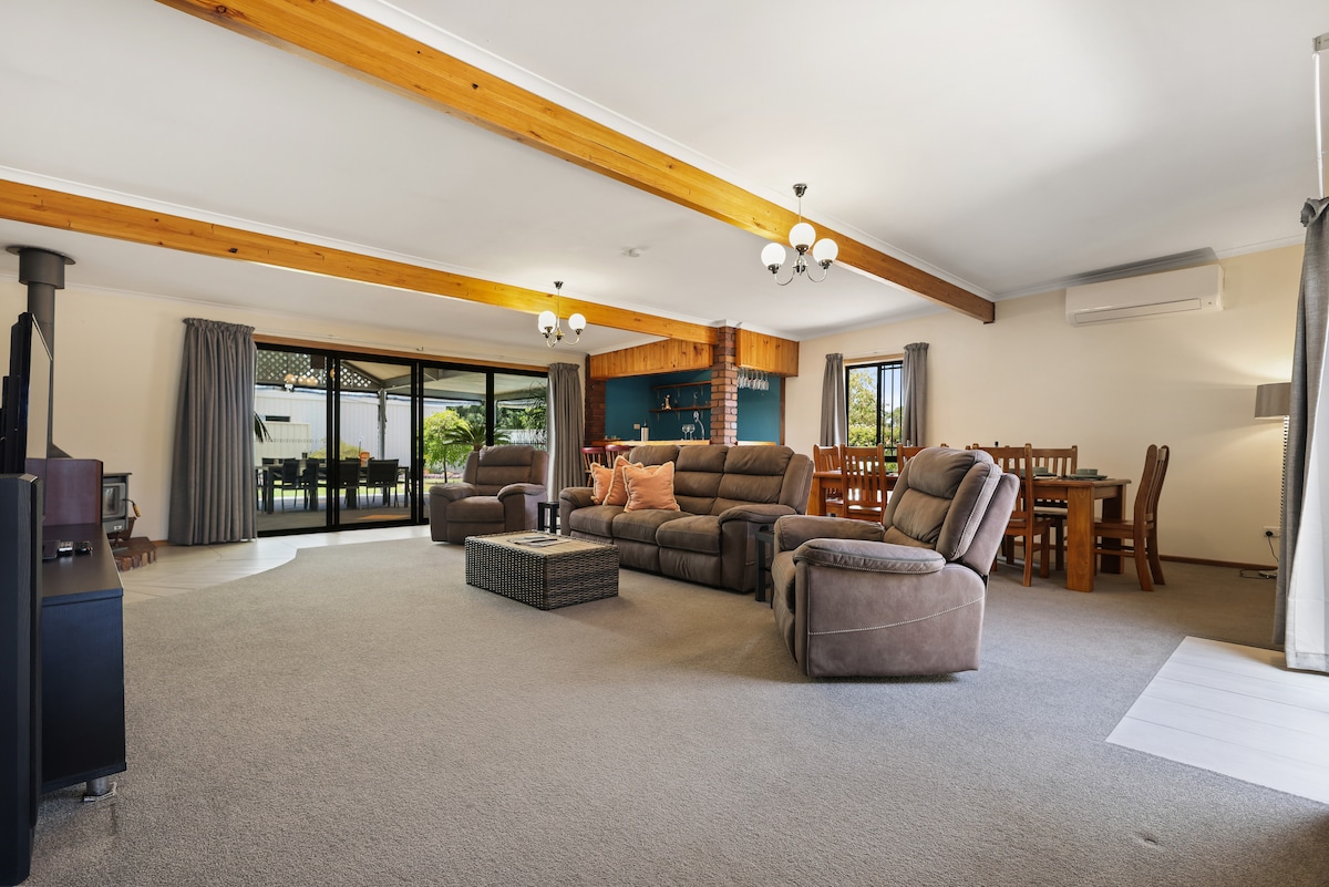3-acre property on the back of a vineyard and on the bank of the Currency Creek Inlet. When you drive in off the dirt road you cannot believe what a hidden gem with such a spectacular view! This country home has 4 spacious bedrooms, 4 living areas including the main lounge with recliner chairs and fireplace, social room with pool table, the ‘Looking Room’ because the view is breathtaking and the Sunroom with large 10-seater dining table. Will also see “Alphie” the alpaca & his sheep walking by.