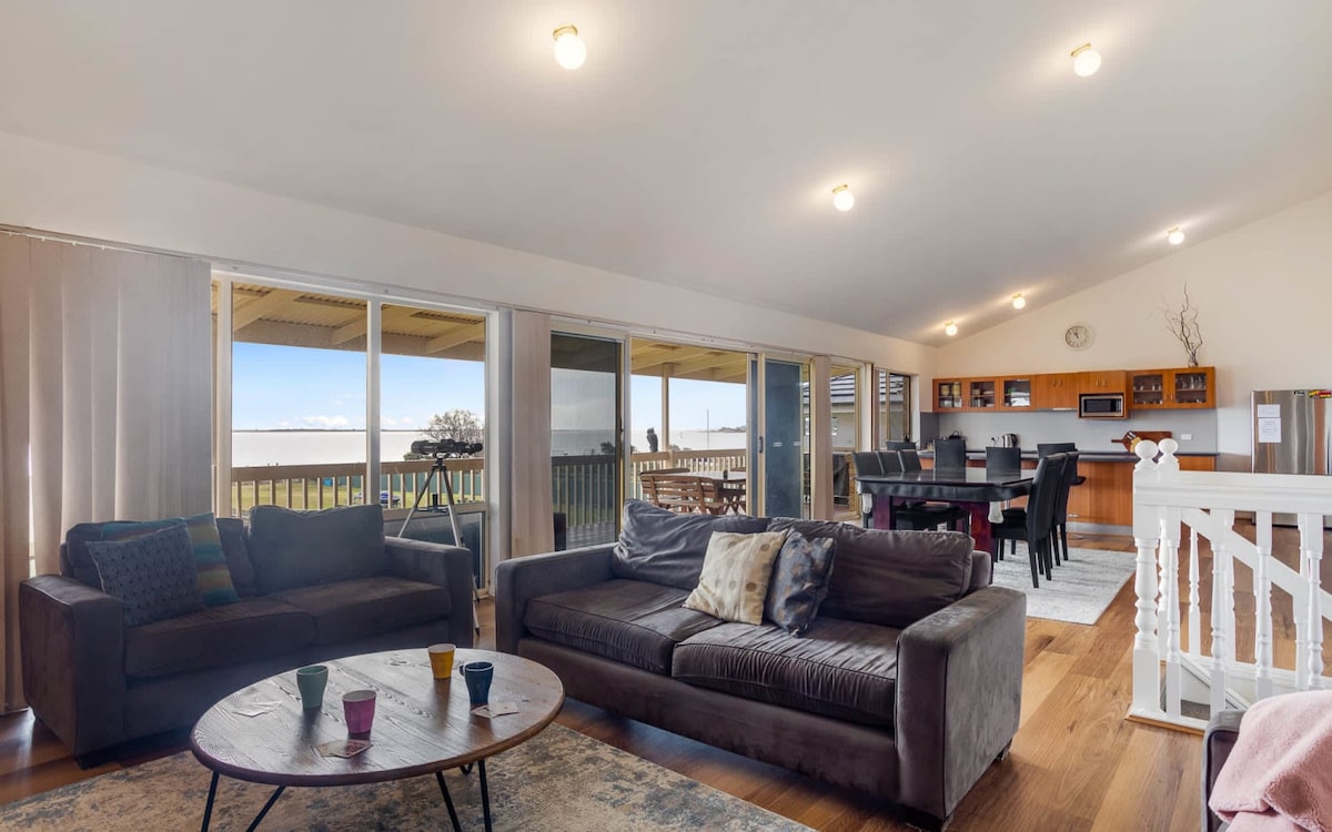 Panoramic lake and hills views from inside and out of this beautiful lakefront home by the beach. This large, stunning beachside holiday home will provide you with the space for your family and friends to relax and re-energise. Sparkling blue water literally on your doorstep for you to swim, paddle, relax or even fish.