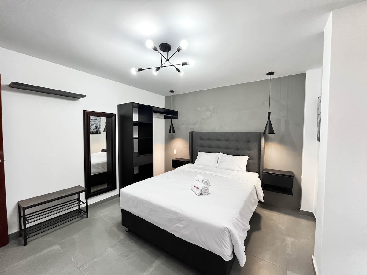 Enjoy a premium experience in this modern, fully equipped apartment. ✨ We offer: • Queen-size bed • 55” TV in the living room and 43” TVs in the bedrooms • Private balcony with panoramic city view • Fully equipped open-plan kitchen • Warm LED lighting and modern designer décor • Common areas with coworking space, terrace, and outdoor gym 🌟 Ideal for: Couples, business travelers, digital nomads, or tourists who value design, cleanliness, and the overall experience.