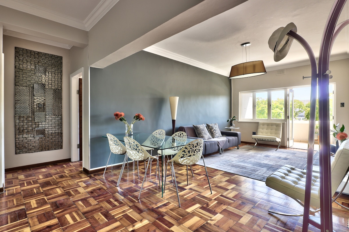 Welcome, dear guest! Our cozy flat in central Cape Town offers breathtaking views of Table Mountain and the city. Bright and spacious, it’s perfect for work or leisure, with no electricity loadshedding. Enjoy the wrap-around terrace and our cherished artworks. Steps away are top restaurants and attractions, with public transport at your doorstep. Equipped with all comforts and a 24/7 concierge, you'll feel cared for. Enjoy your stay with us and make yourself at home! Alex & Aiwe